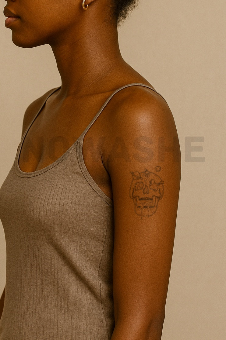 nowashe tattoos is designed for all skin tones, but the fully developed color is uniquely influenced by individual skin chemistry. The result can range from a blue/green, to a distinctive dark blue/black.