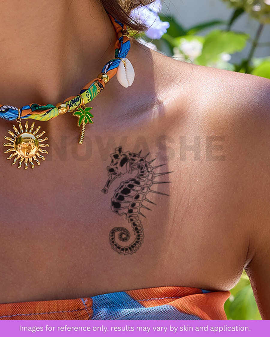 nowashe tattoos is designed for all skin tones, but the fully developed color is uniquely influenced by individual skin chemistry. The result can range from a blue/green, to a distinctive dark blue/black.