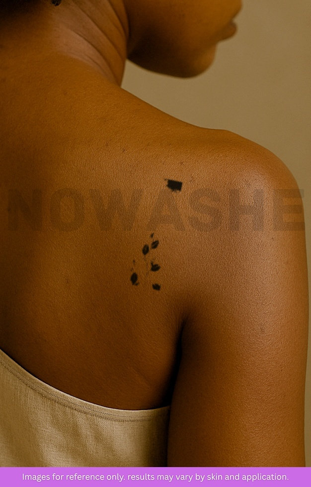 nowashe tattoos is designed for all skin tones, but the fully developed color is uniquely influenced by individual skin chemistry. The result can range from a blue/green, to a distinctive dark blue/black.
