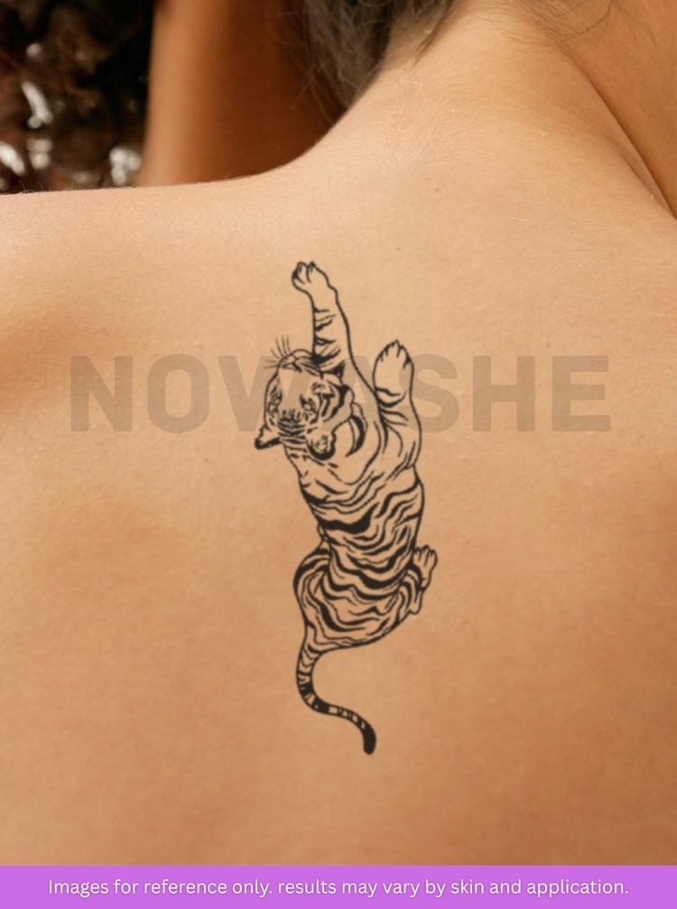 Get wild with nowashe Tattoos' See My Stripes! This water-resistant semi-permanent tattoo features a fierce tiger and playful cat, perfect for animal lovers and cartoon enthusiasts alike. Embrace your wild side with these stylish stripes.