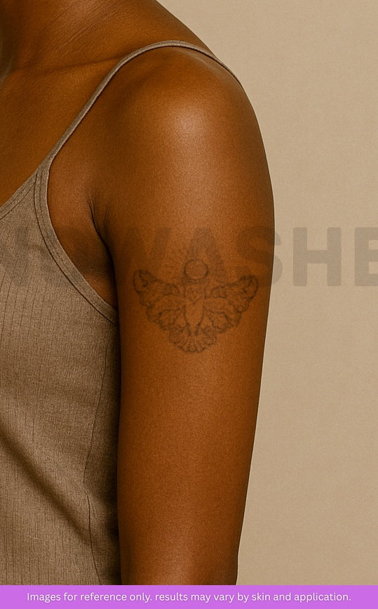 nowashe tattoos is designed for all skin tones, but the fully developed color is uniquely influenced by individual skin chemistry. The result can range from a blue/green, to a distinctive dark blue/black.