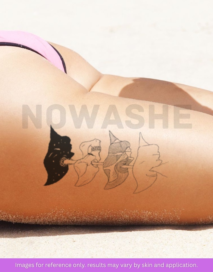 nowashe tattoos is designed for all skin tones, but the fully developed color is uniquely influenced by individual skin chemistry. The result can range from a blue/green, to a distinctive dark blue/black.