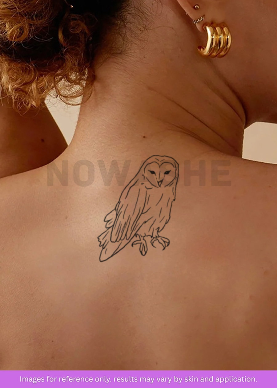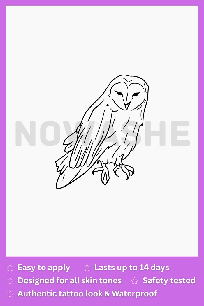 The Tyto Alba semi-permanent tattoo design by nowashe Tattoos showcases a beautiful barn owl graphic with highly detailed linework. Drawing inspiration from nature and artistic techniques, this tattoo is an ideal choice for individuals who appreciate animals. Additionally, it is water-resistant for long-lasting wear.