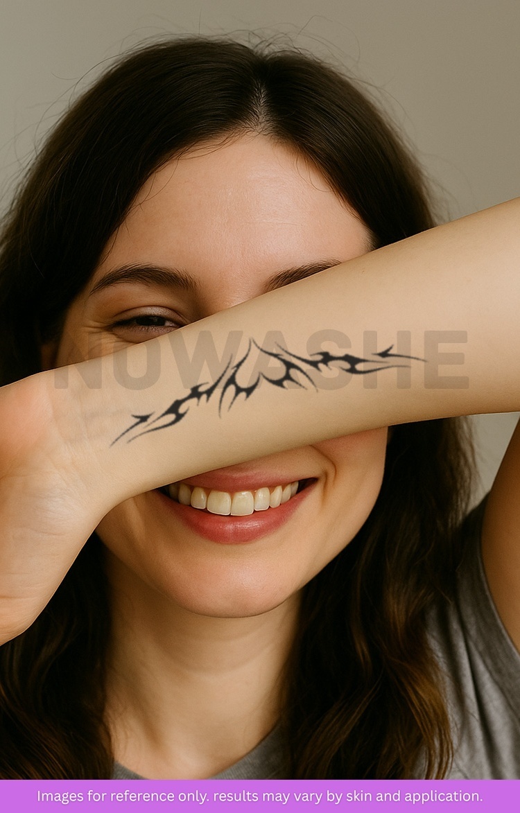 nowashe tattoos is designed for all skin tones, but the fully developed color is uniquely influenced by individual skin chemistry. The result can range from a blue/green, to a distinctive dark blue/black.