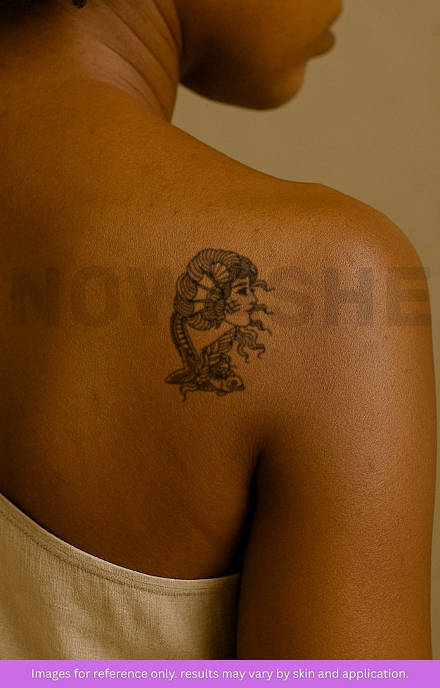 nowashe tattoos is designed for all skin tones, but the fully developed color is uniquely influenced by individual skin chemistry. The result can range from a blue/green, to a distinctive dark blue/black.